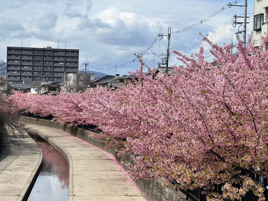 現在は水路沿い約1.1kmにわたり約200本の河津桜が植えられており、京都でも有数の早咲き桜の名所として知られています。