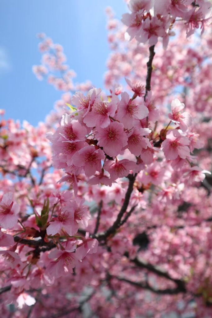 濃いピンクの河津桜はとても華やかで、写真映えするスポットです。
